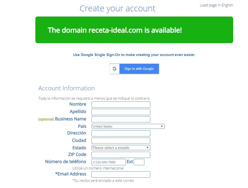 3. Escribe el nombre de dominio en el cuadro de la izquierda (Create a new domain) Ej: receta-ideal.com y luego haz clic en «continuar» para iniciar el proceso de registro.