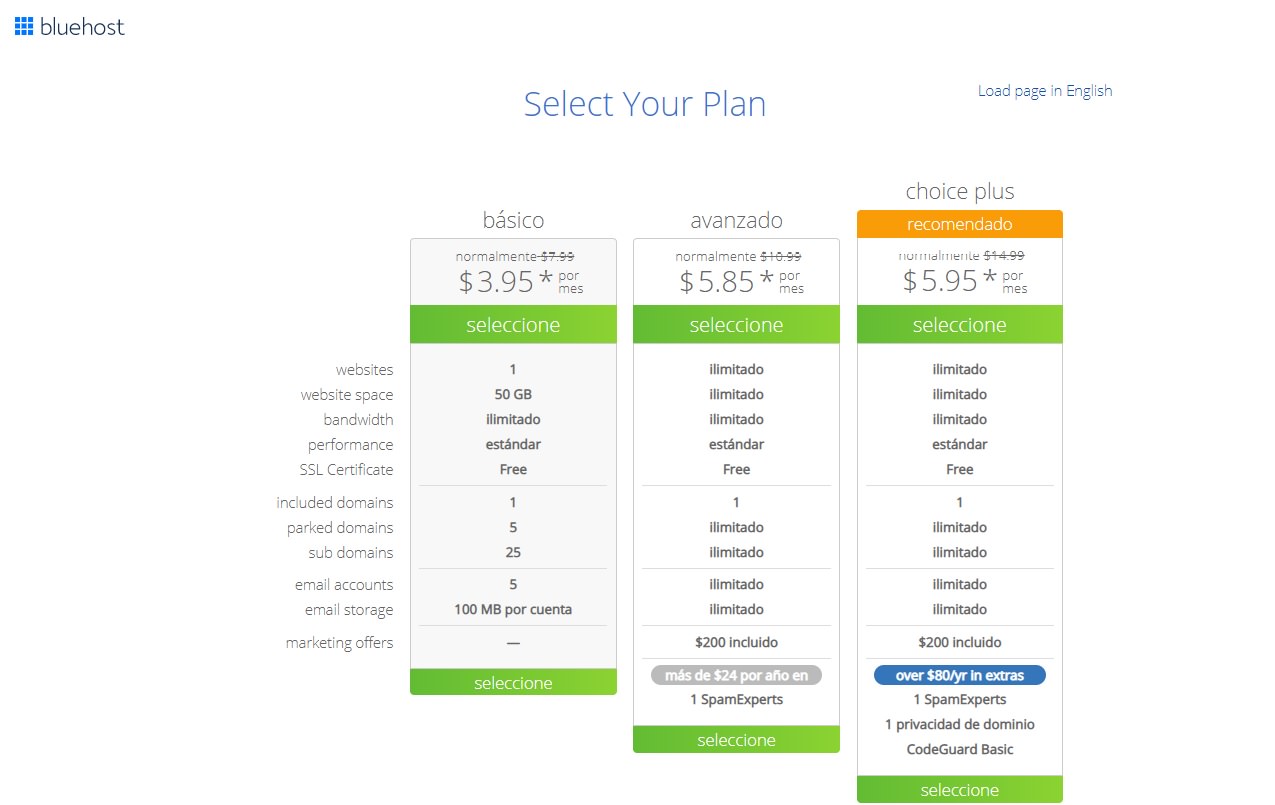 2. Selecciona tu plan. Recomiendo que los nuevos bloggers obtengan el plan básico. Haz clic en «Seleccione» para elegir tu plan.