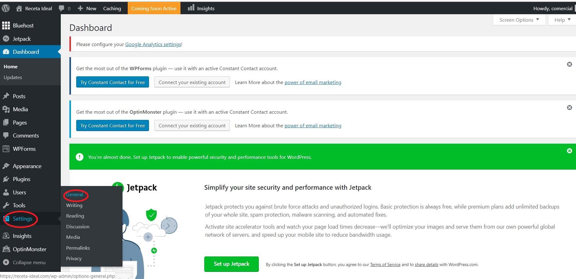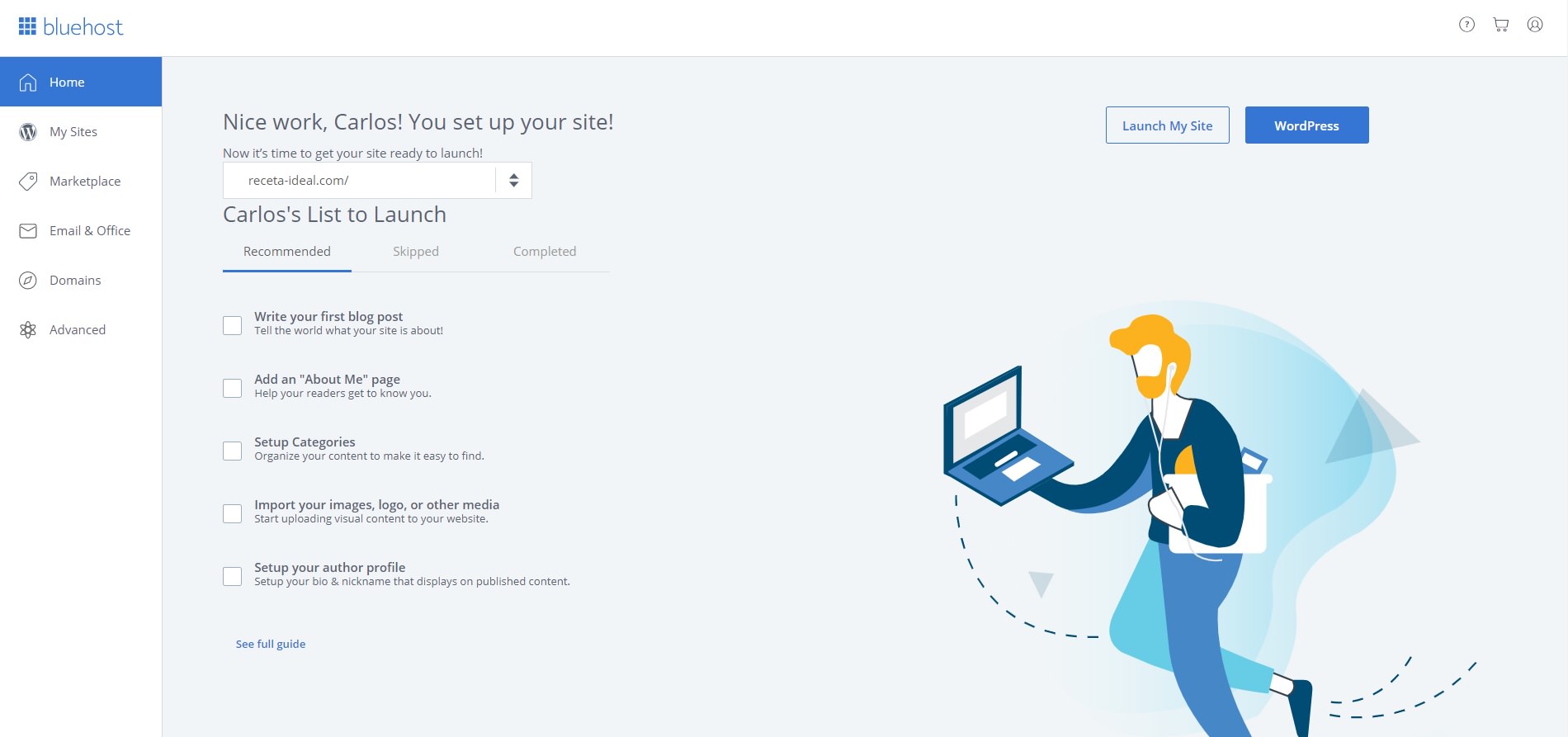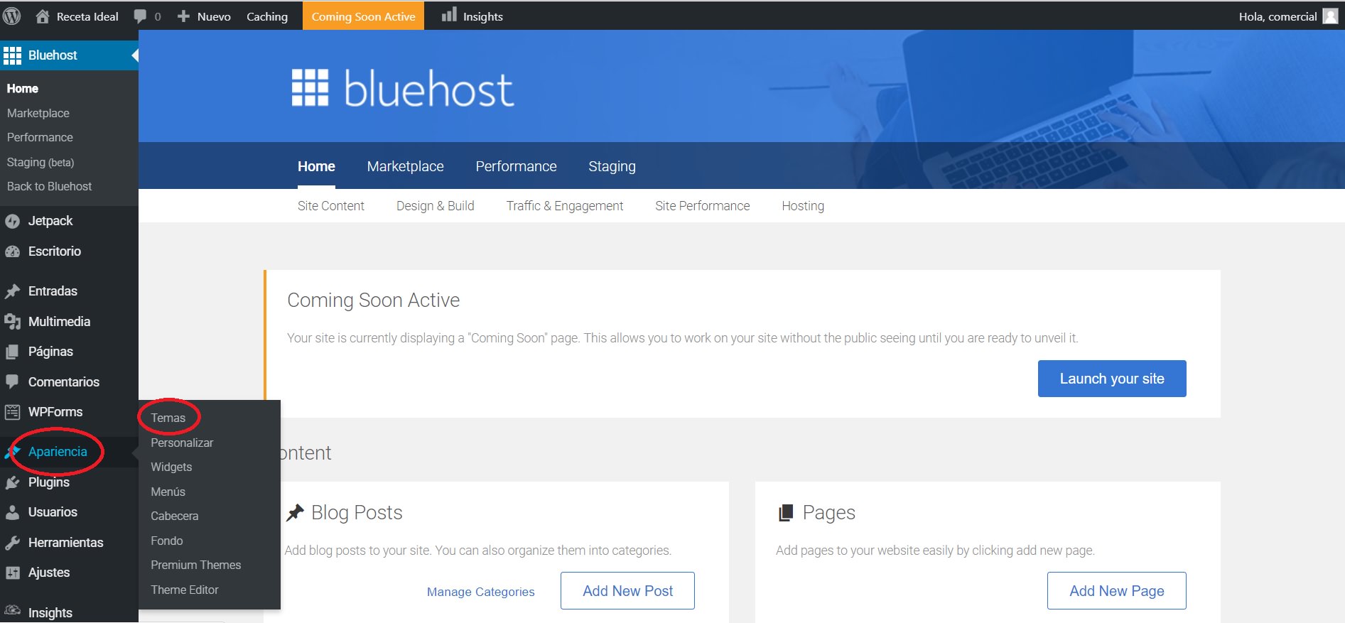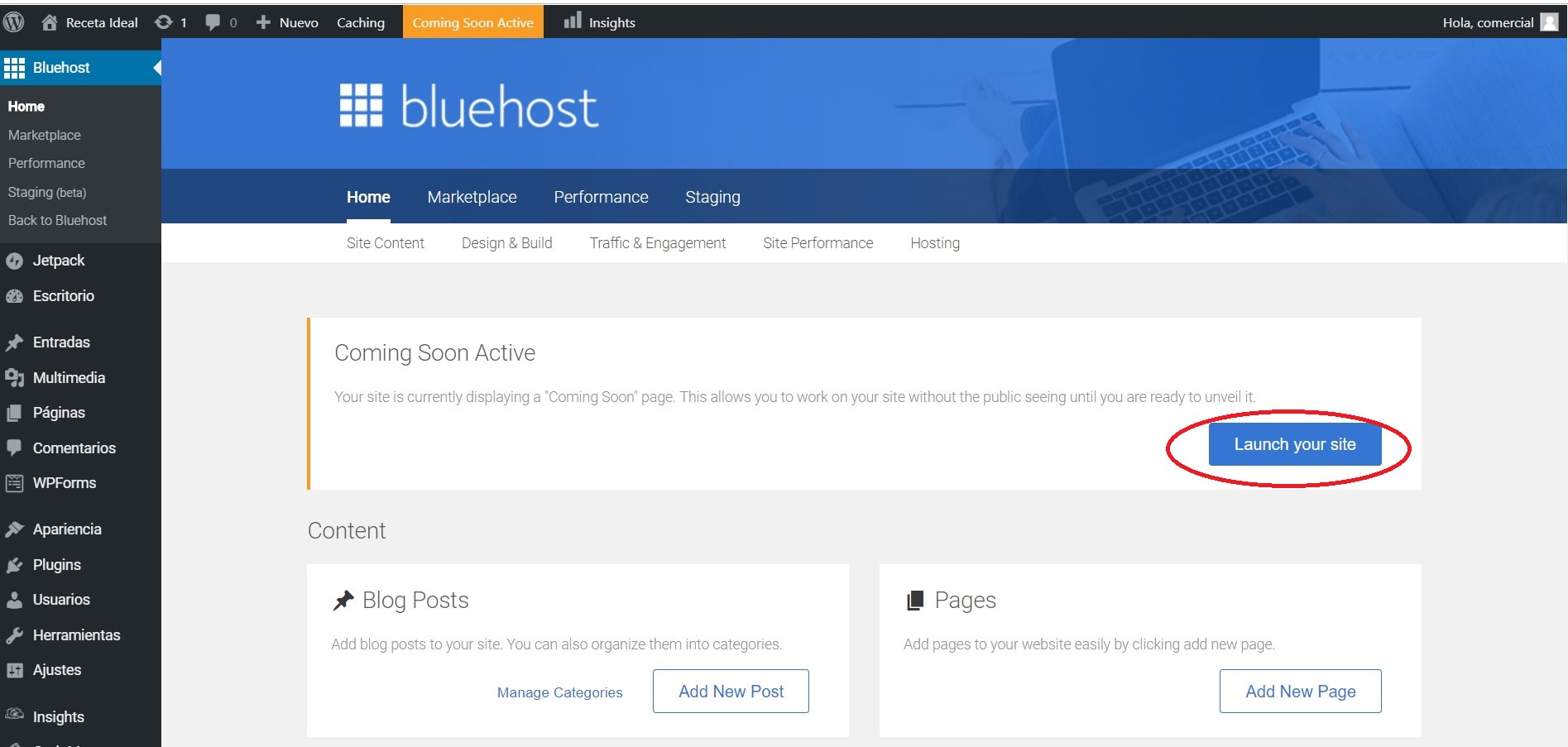 Cuando estés listo para hacer público su blog, haz clic en el menú «BlueHost» en la parte superior izquierda del menú en tu área de administrador, luego haz clic en el botón azul «Launch your site» para eliminar la página «Próximamente» o “Coming Soon”.