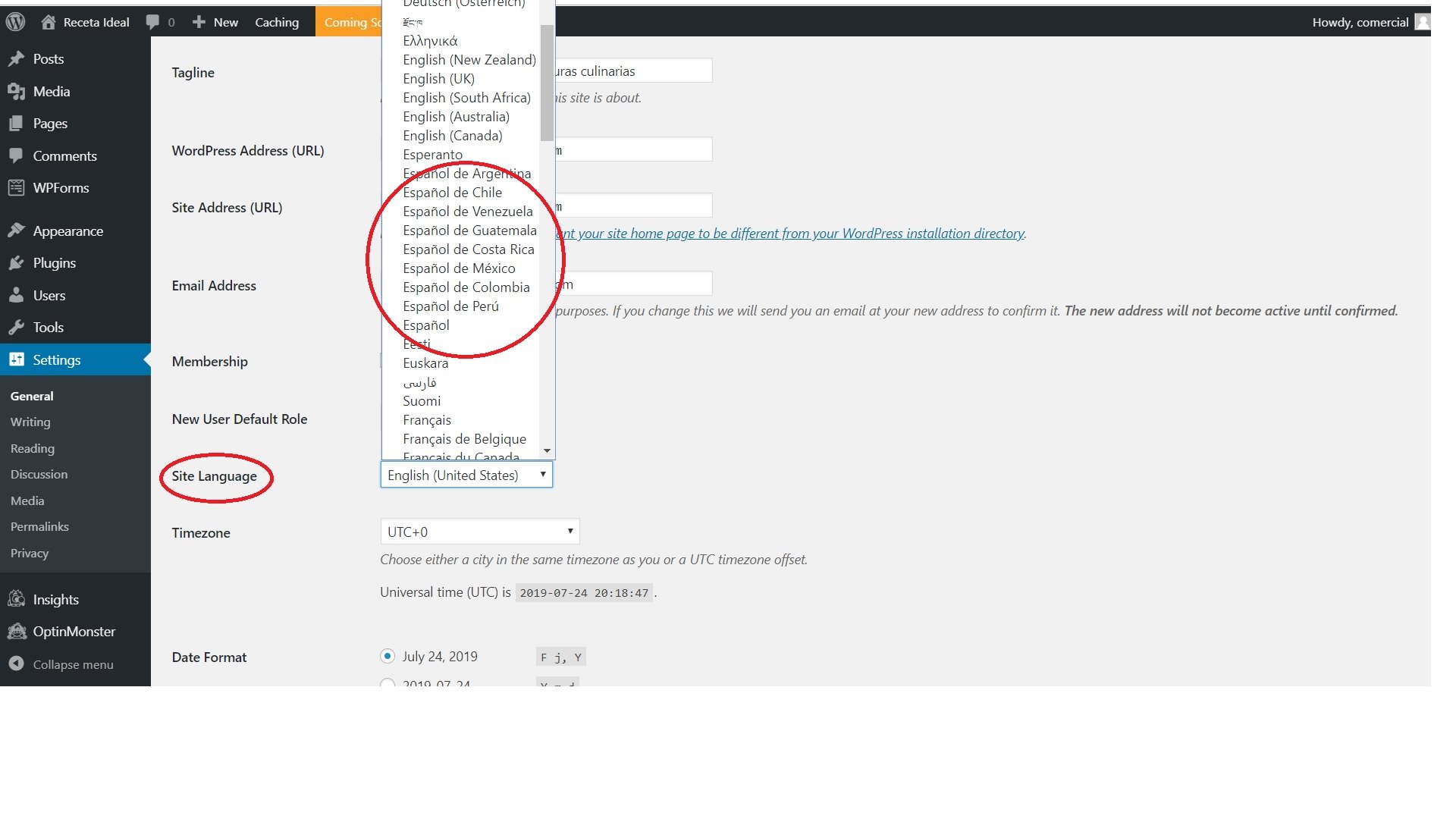 Cuando te encuentres en la sección “General”, desliza el cursor hasta la opción “Site Language” y allí, escoge la opción de Español que mejor se ajuste a tus necesidades.