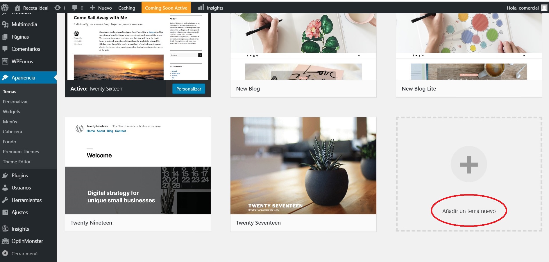 Si no te gusta ninguno de los temas que ya están instalados, puedes elegir fácilmente entre miles de otros temas gratuitos. Para instalar un nuevo tema, dentro de la página «Temas”, haz clic en «Añadir un tema nuevo».