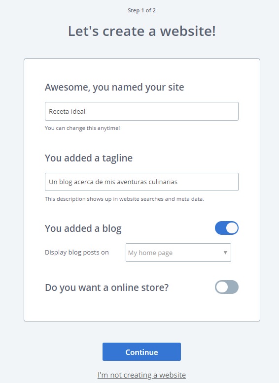 - En la primera casilla escoge el nombre que mejor represente tu sitio web, en este caso he decidido llamar mi sitio web Receta Ideal. (Puedes cambiar el nombre de tu sitio cuando lo desees). Además tienes la posibilidad de agregar una etiqueta que identifique lo que la gente puede encontrar en tu sitio web, en mi caso me he ido por la opción “Un blog acerca de mis aventuras culinarias”. De nuevo, esta opción puedes cambiarla cuando quieras.