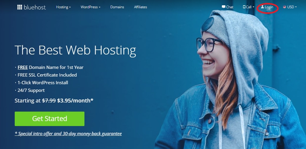 Si aún nos ha iniciado sesión, dirígete a Bluehost.com y haz clic en «Login» en la parte superior derecha para que aparezca la pantalla de inicio de sesión.