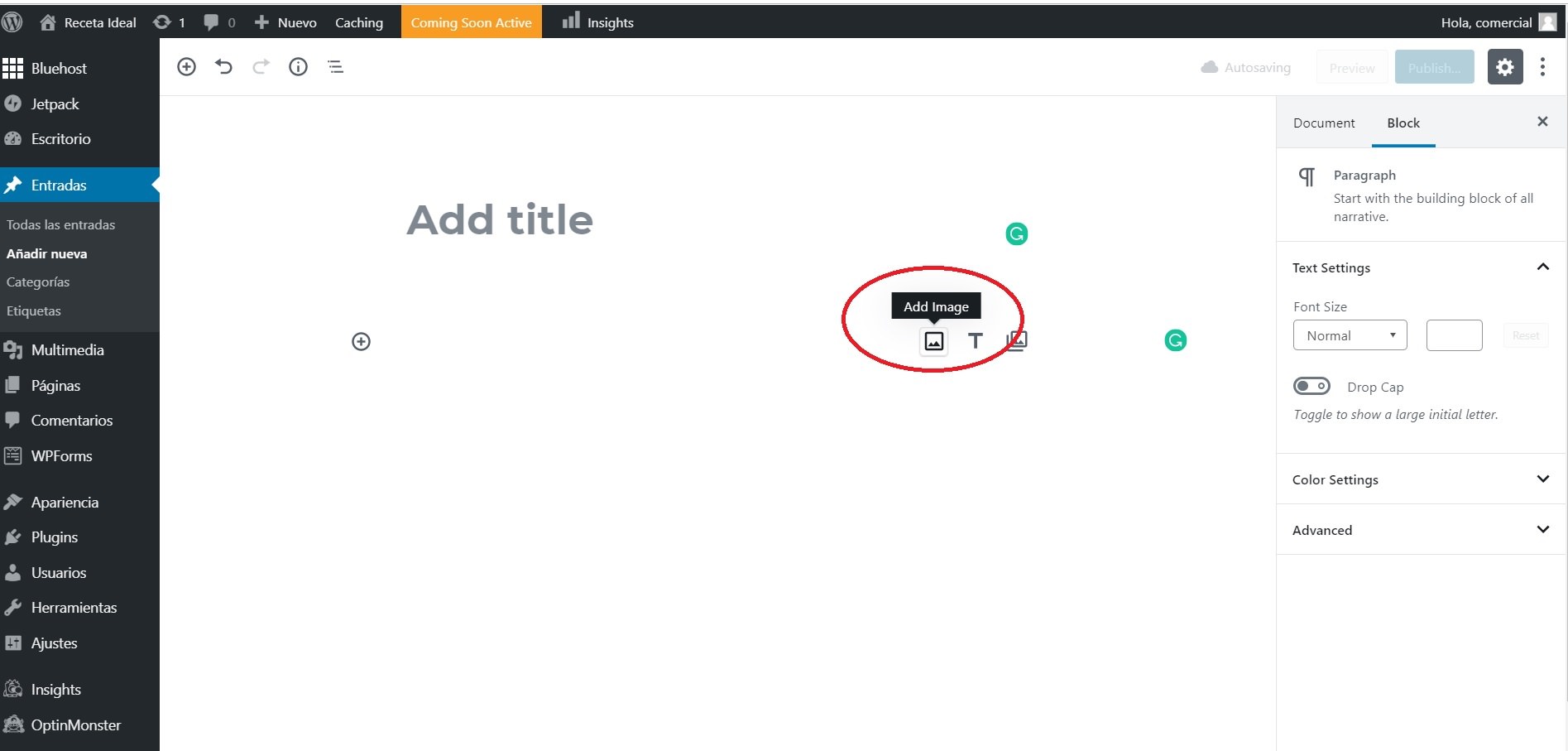 Si deseas agregar una imagen a tu publicación, haz clic en el icono «Add Image» y haz clic en «Upload» para cargar una imagen desde tu computadora.