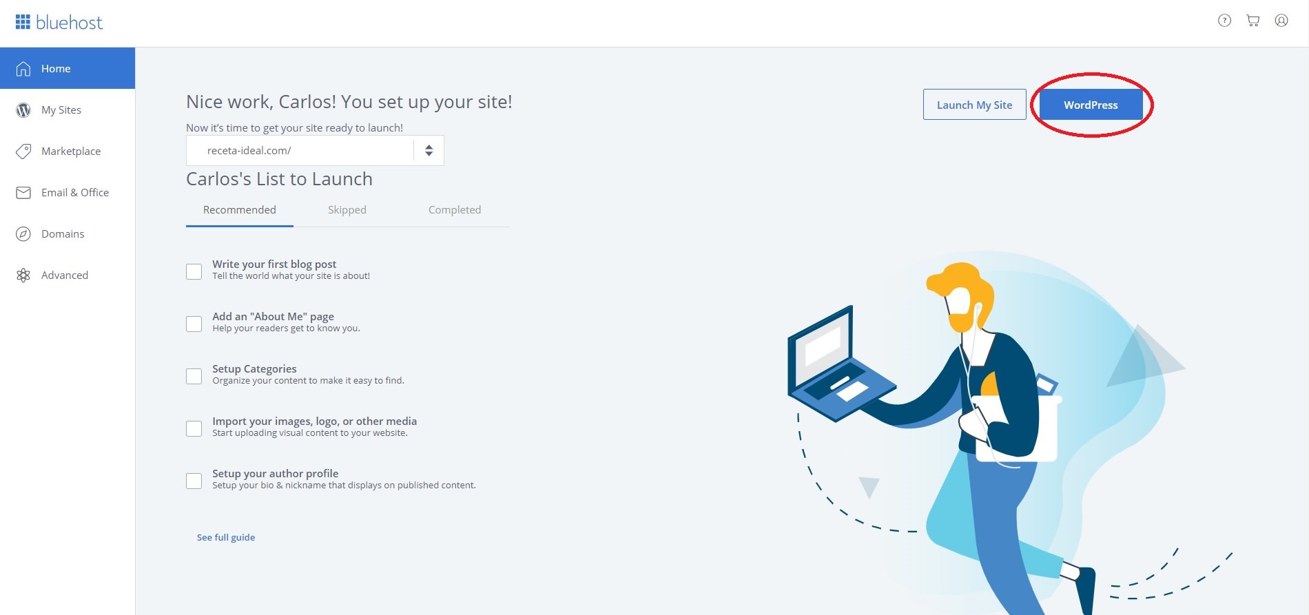 Una vez que inicies sesión, serás llevado al portal de BlueHost. Desde el portal, puedes hacer clic en el botón «WordPress» que encontrarás en la esquina superior derecha para iniciar sesión automáticamente en tu blog en WordPress.